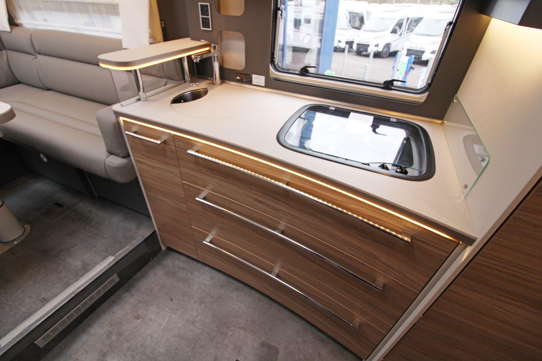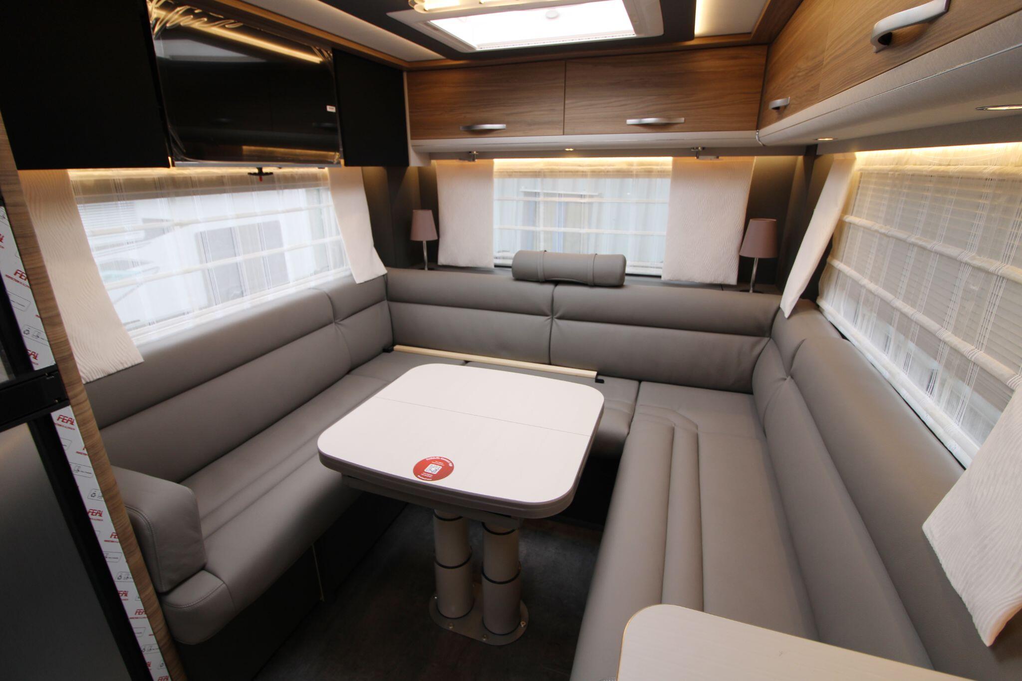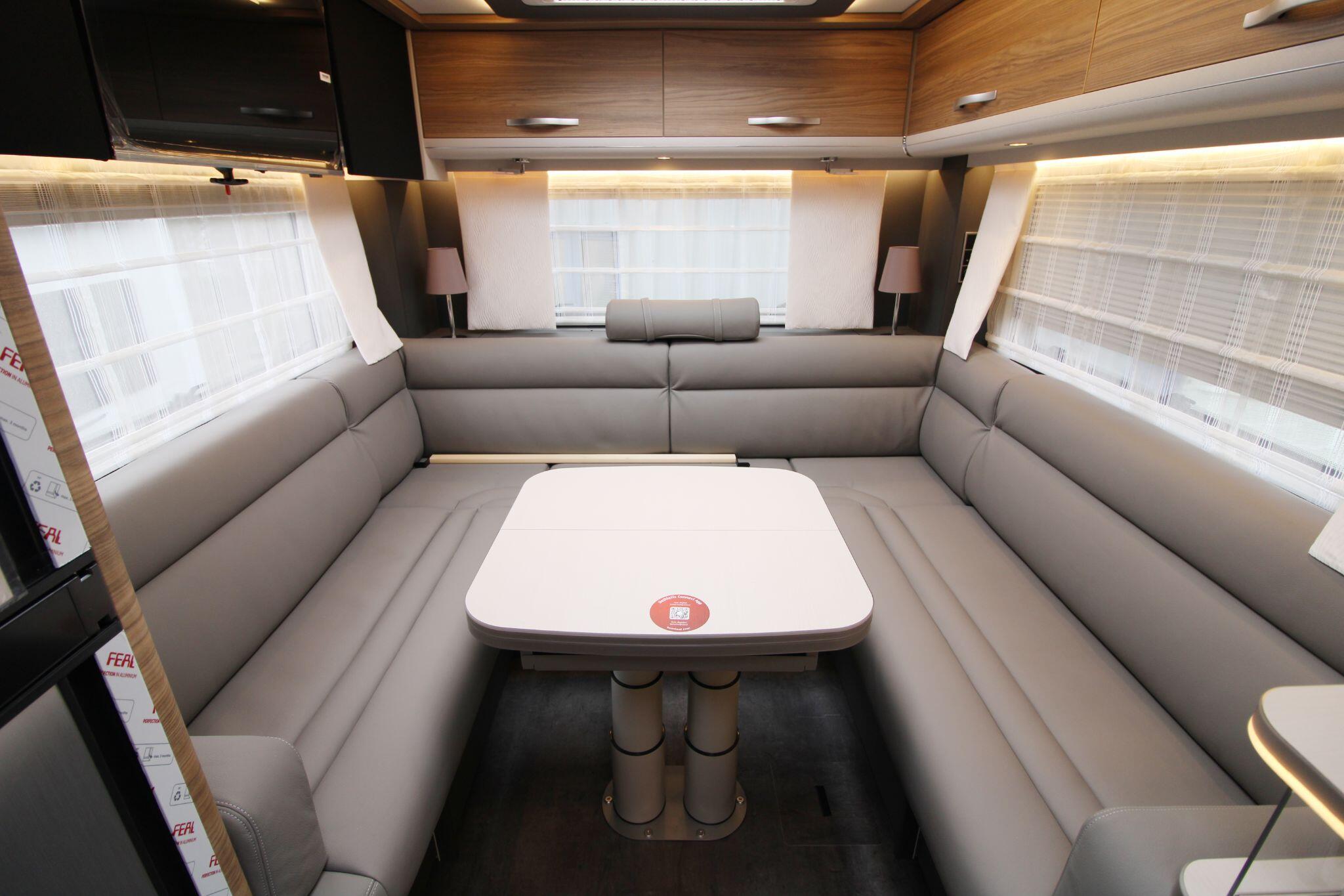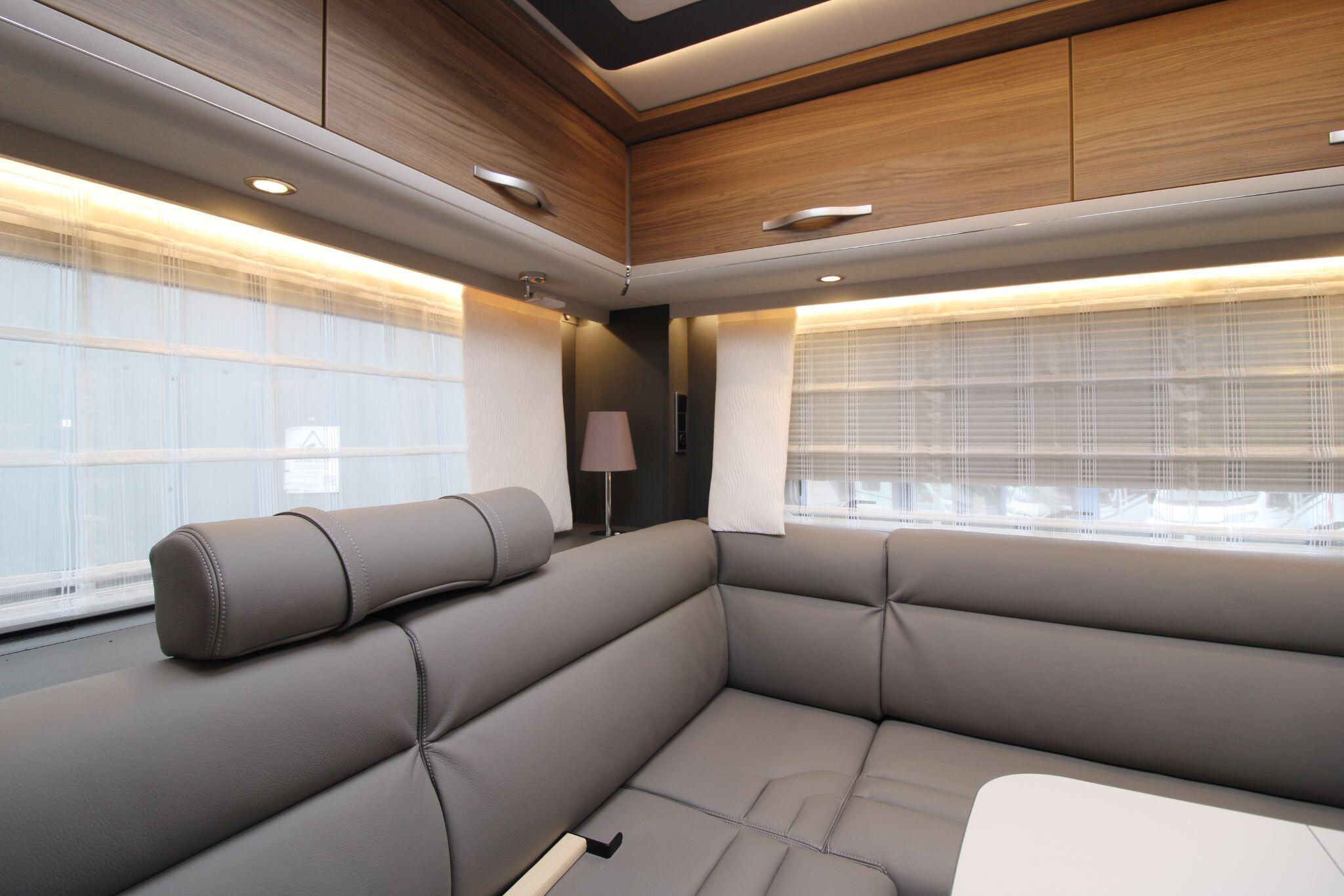 Sleeping up to four people, this model includes comfortable rear beds and the option for additional berths, making it versatile for overnight stays. The lounge area also cleverly adapts to support sleeping arrangements when needed. Large windows and ambient LED lighting create a bright, welcoming environment that feels more like home than a vehicle.
