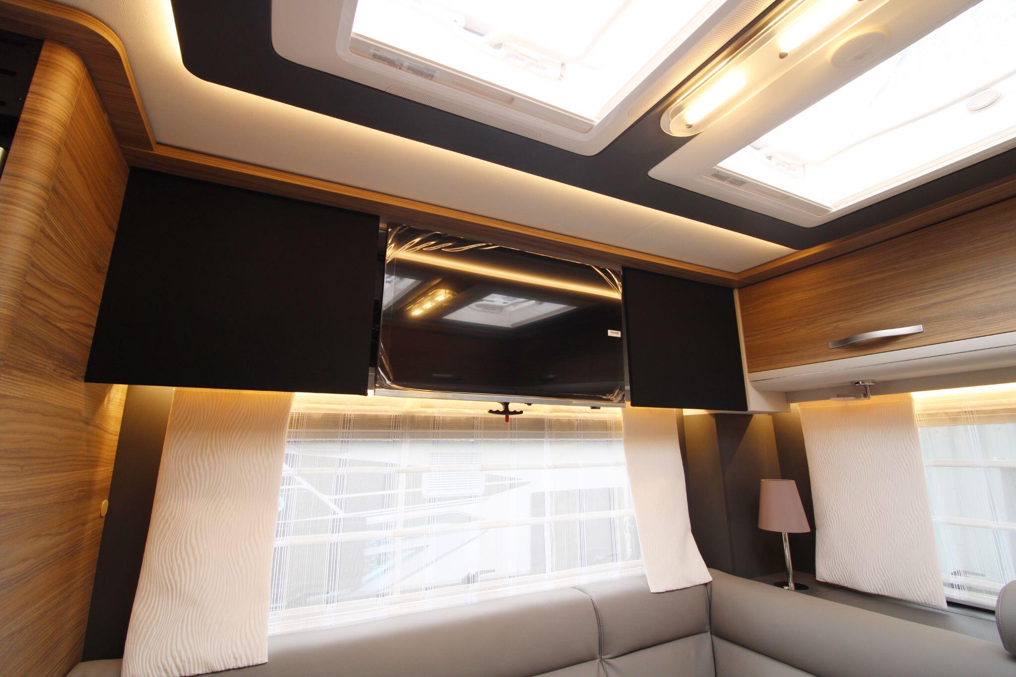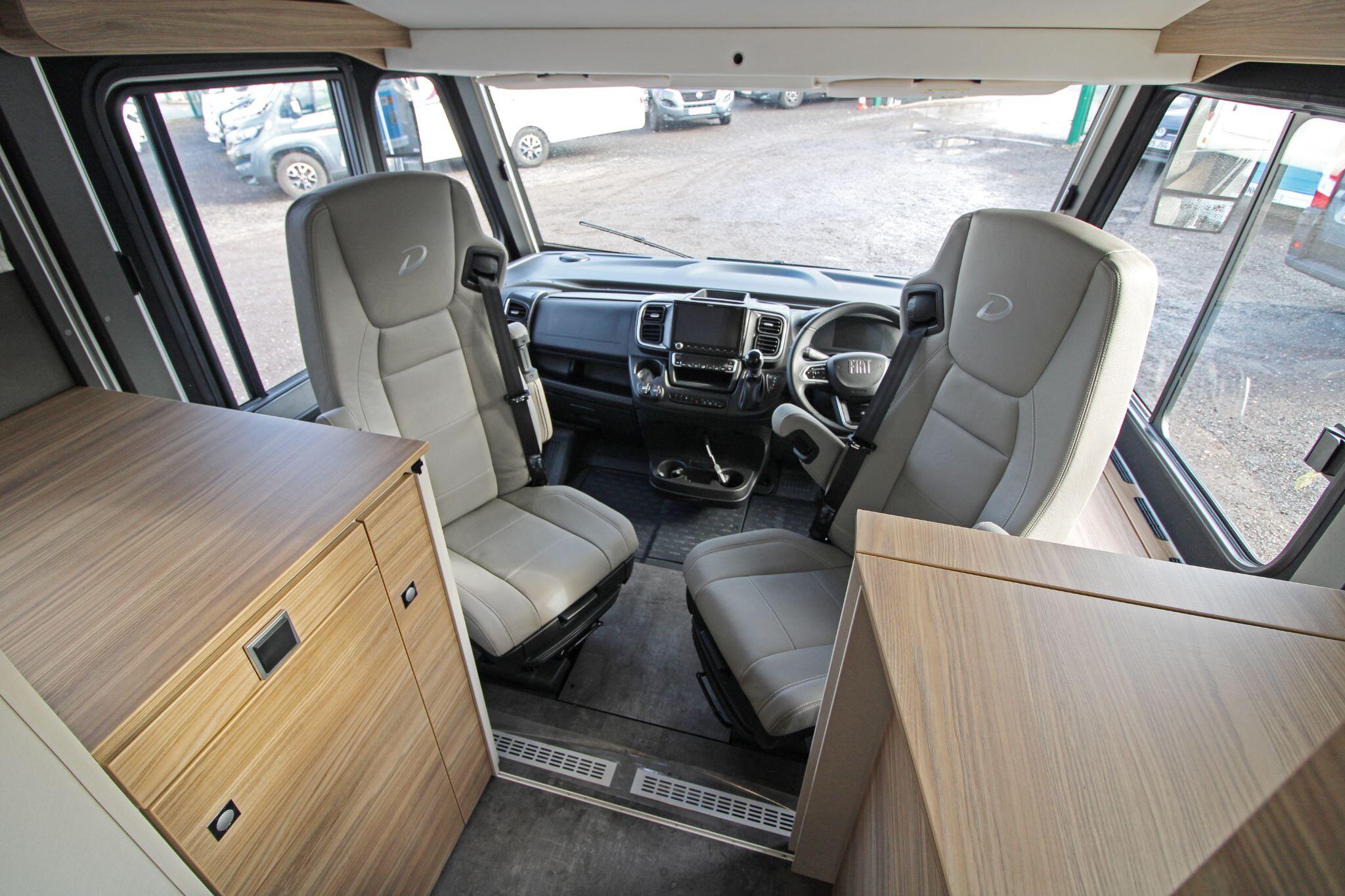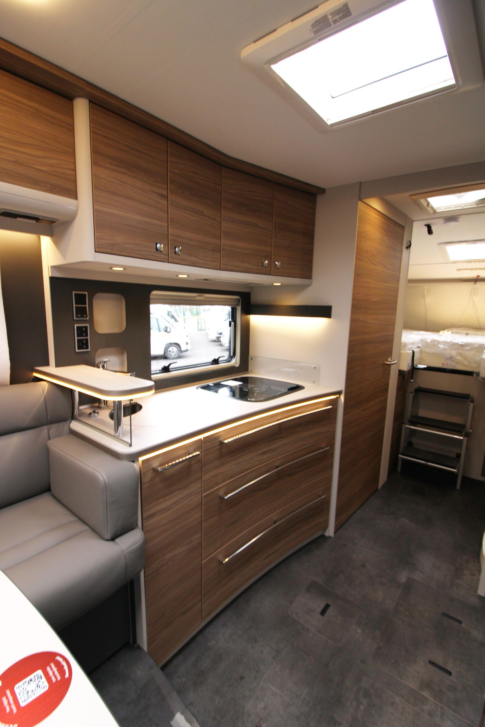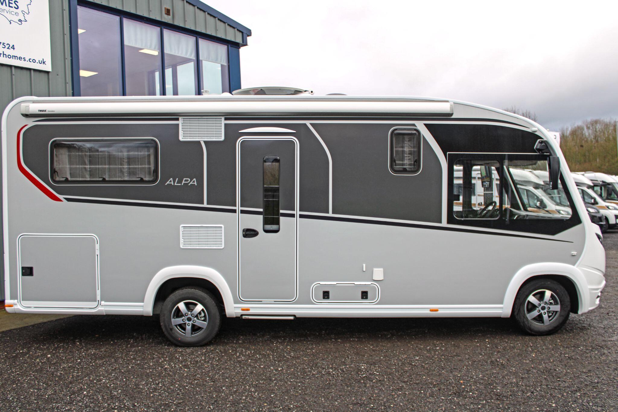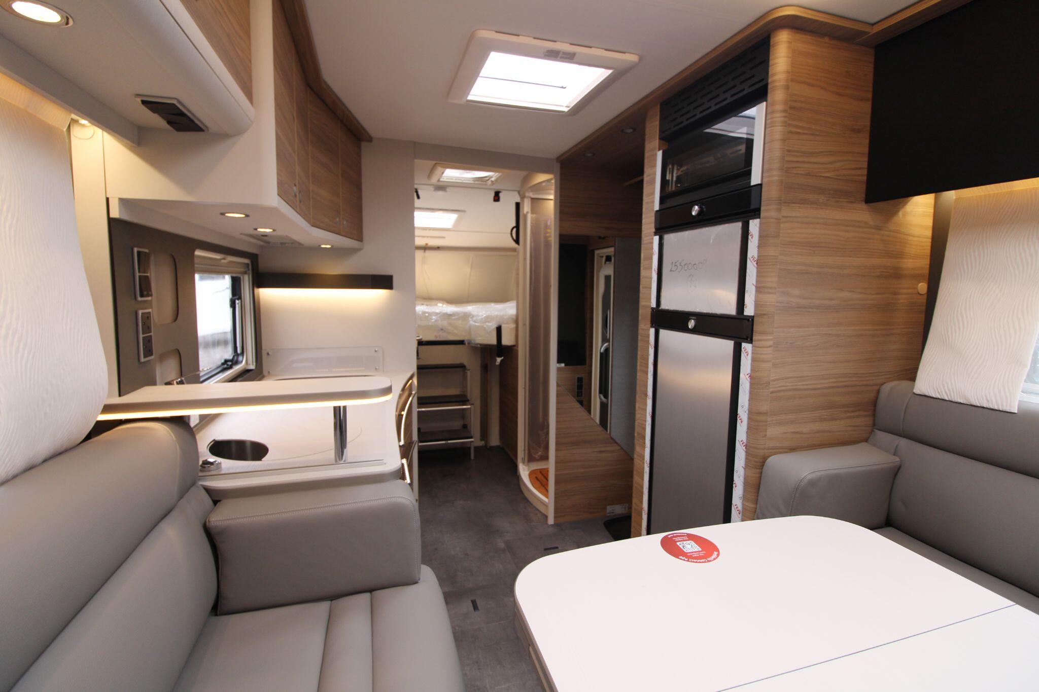 Inside, the Alpa I 6820 delivers a thoughtfully designed living space that maximises comfort and practicality. The interior boasts a spacious rear lounge with panoramic views and plenty of seating, a fully equipped kitchen with ample counter space and storage, and a well-appointed bathroom with a separate shower area — perfect for everyday use or extended touring. Large wardrobes with LED lighting and clever storage solutions throughout help keep belongings organised.