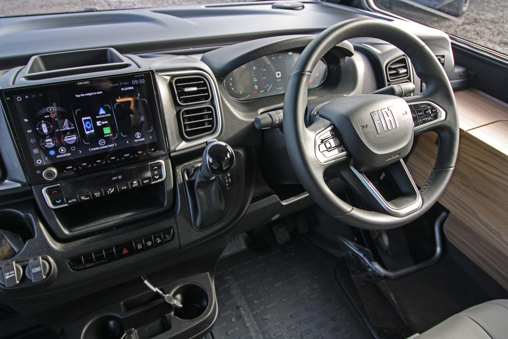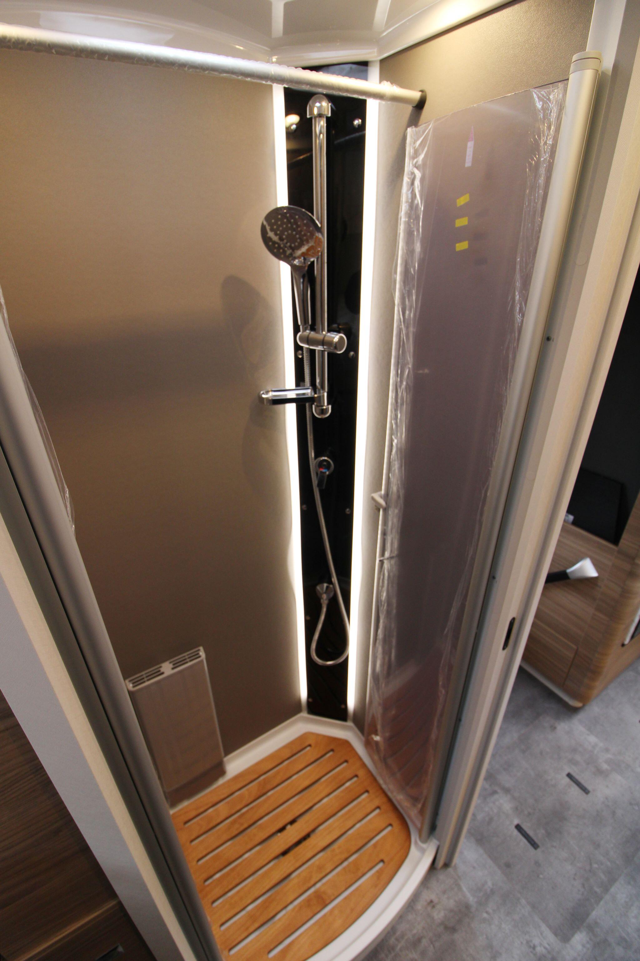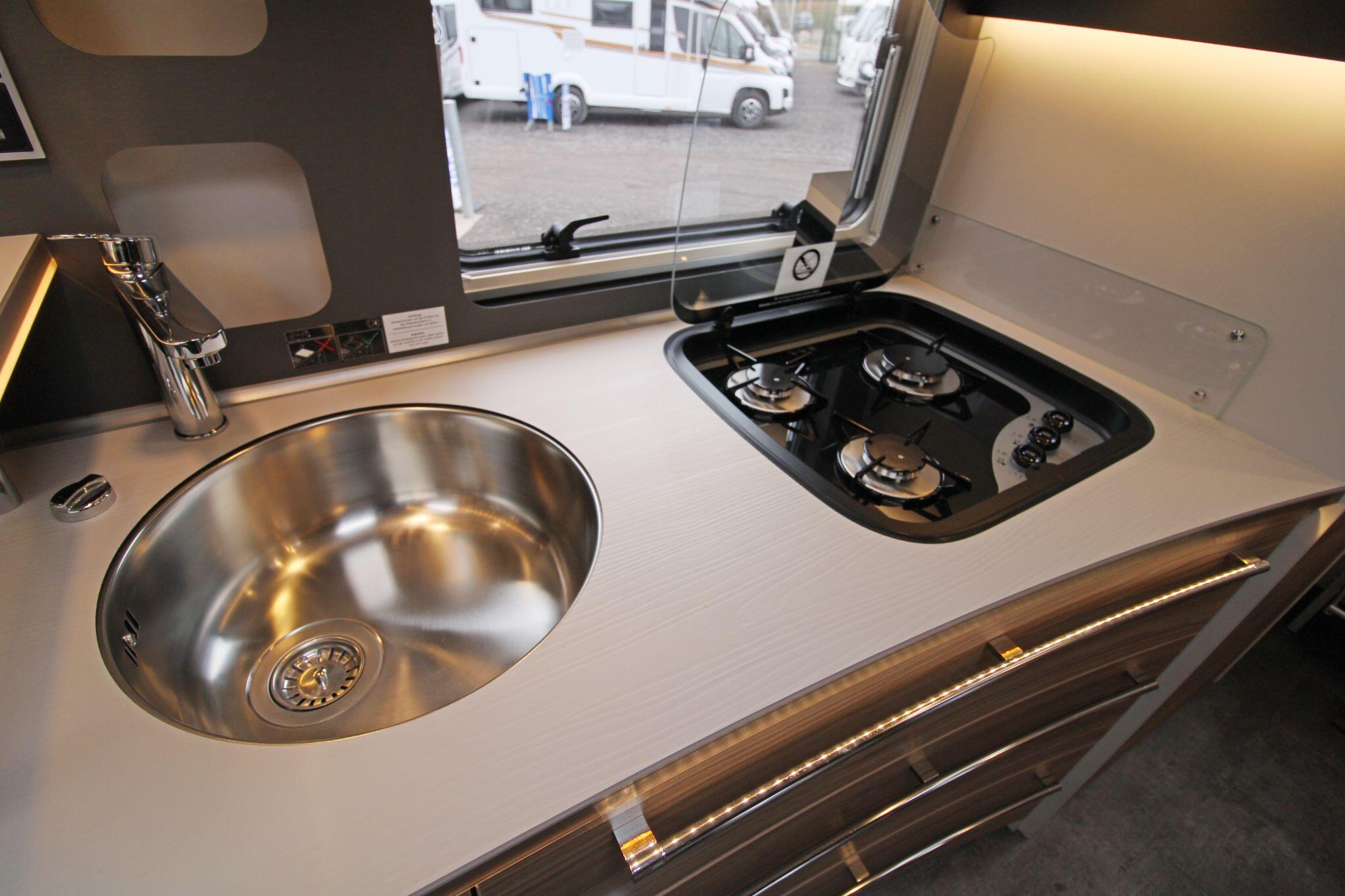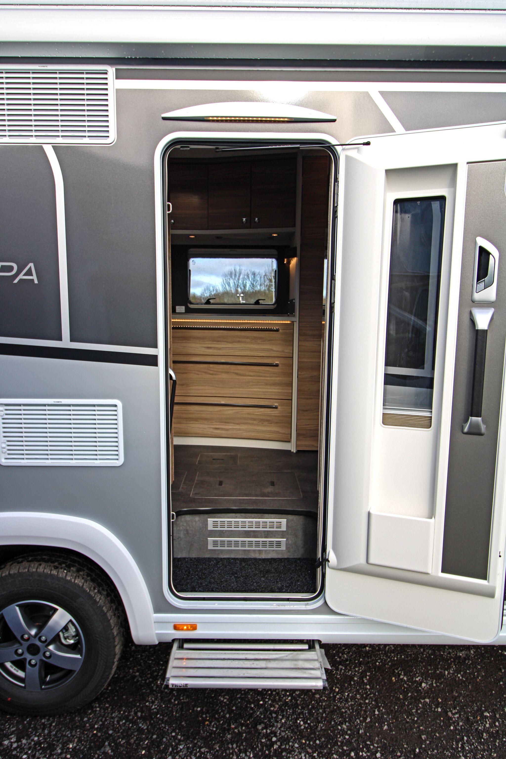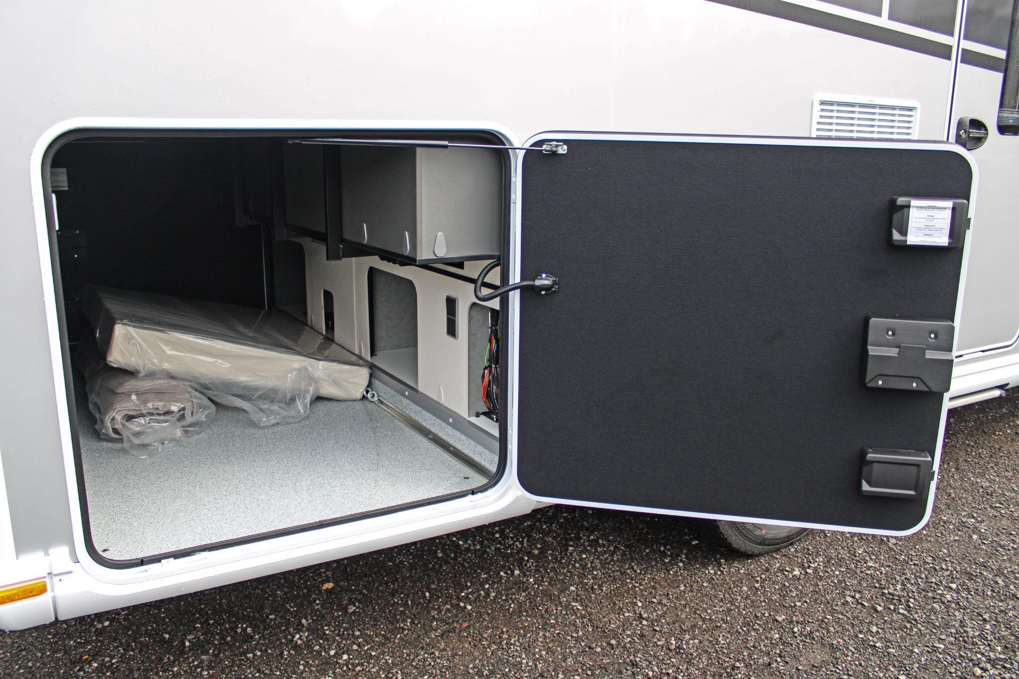 Inside, the Alpa I 6820 delivers a thoughtfully designed living space that maximises comfort and practicality. The interior boasts a spacious rear lounge with panoramic views and plenty of seating, a fully equipped kitchen with ample counter space and storage, and a well-appointed bathroom with a separate shower area — perfect for everyday use or extended touring. Large wardrobes with LED lighting and clever storage solutions throughout help keep belongings organised.