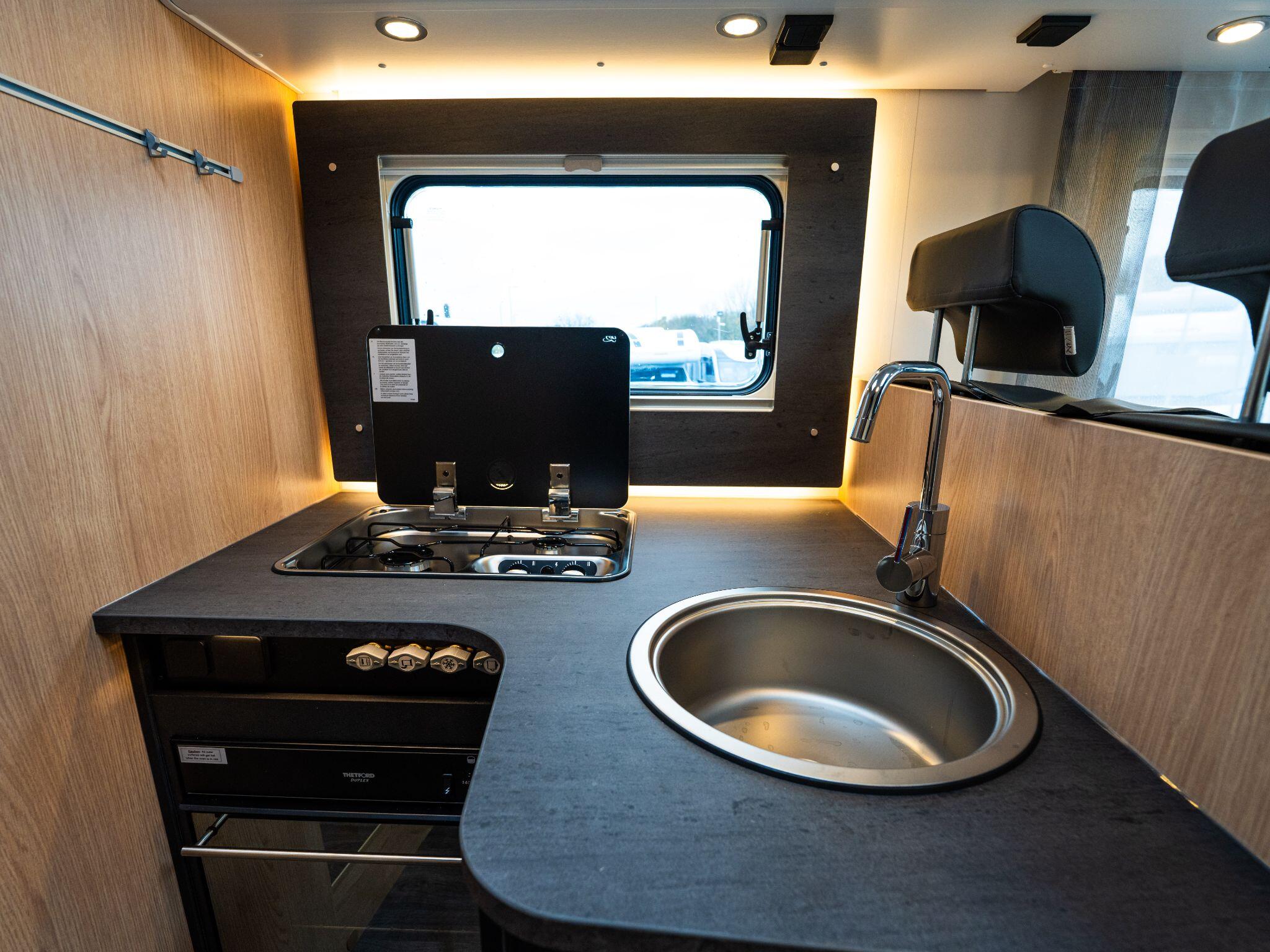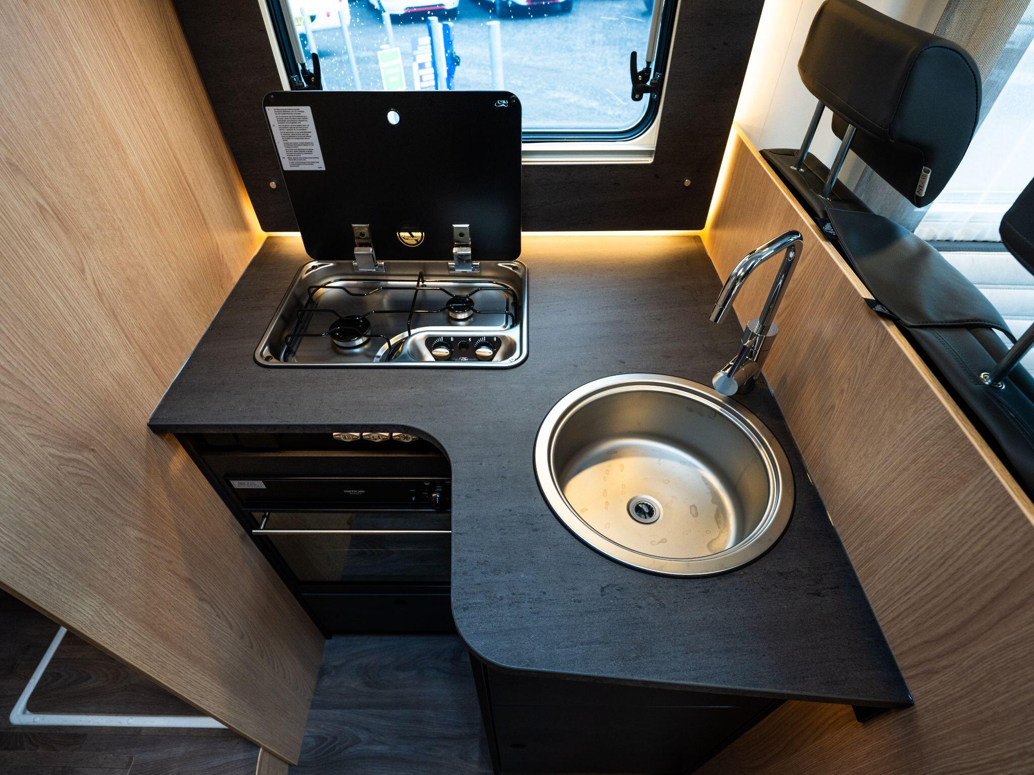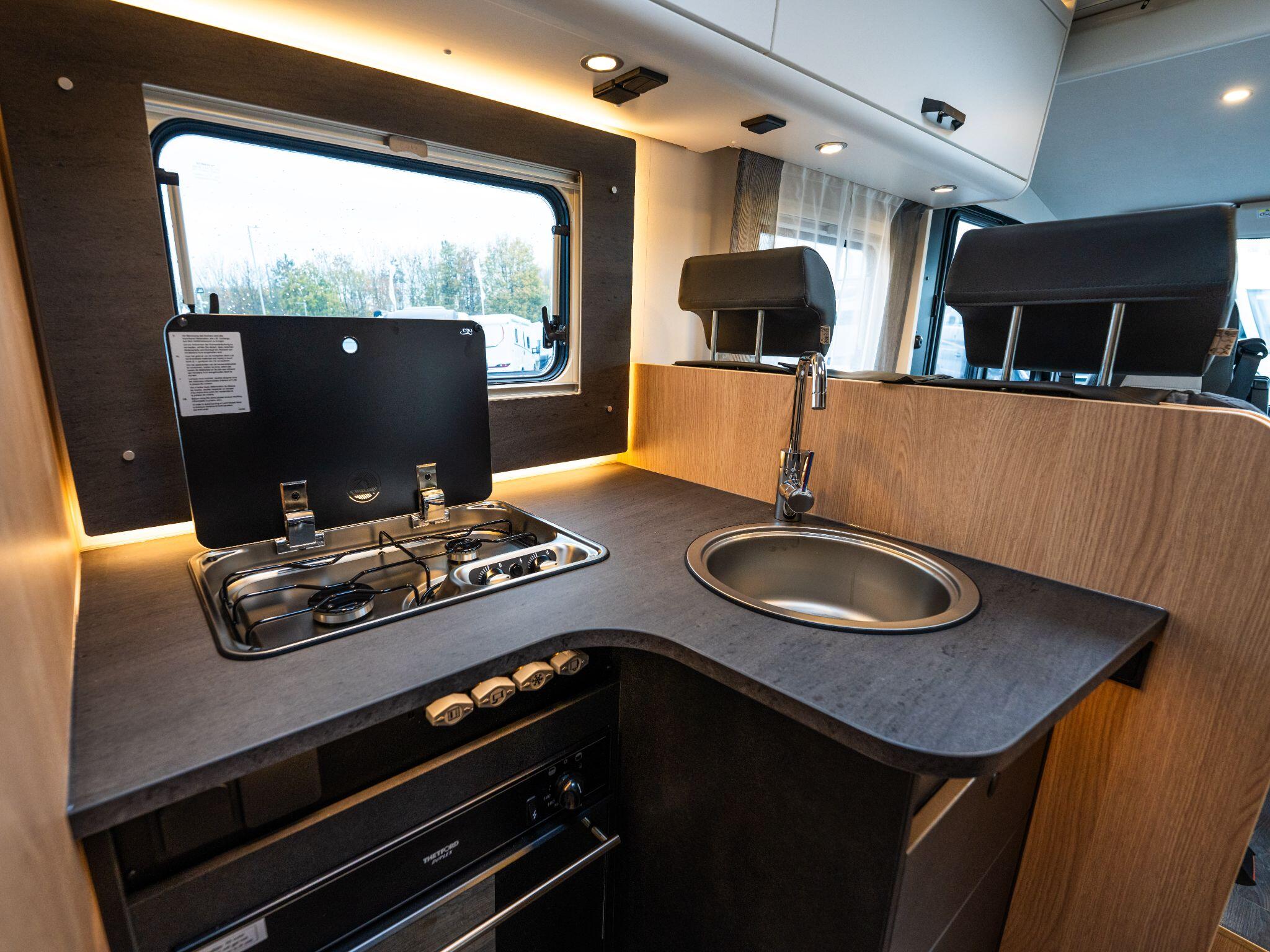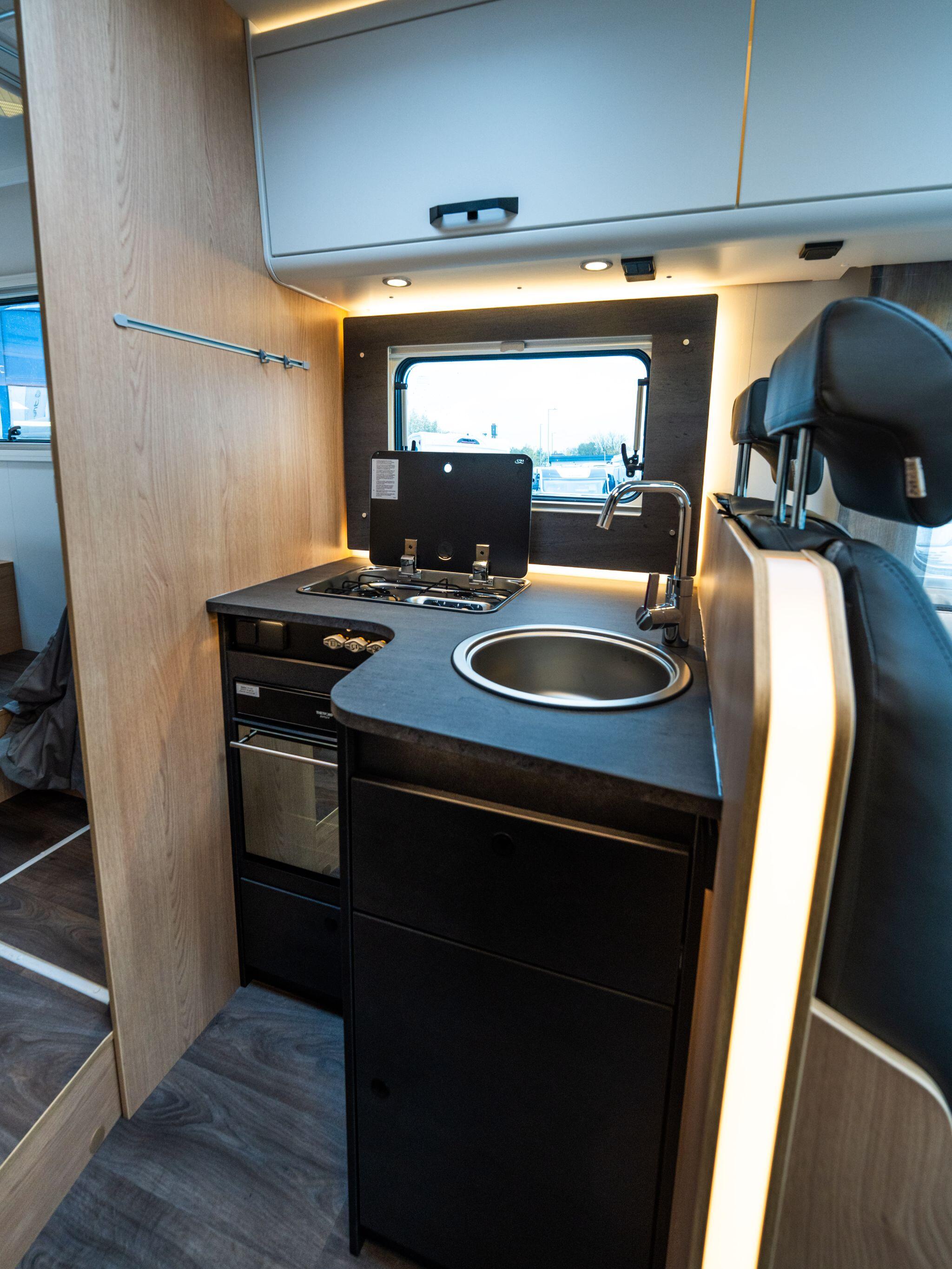 Inside, the “Adventure” soft furnishing theme complements a functional layout that balances comfort and utility. The kitchen comes with a two-flame cooker, large stainless steel sink, and a 156 l fridge with a separate 29 l freezer compartment.