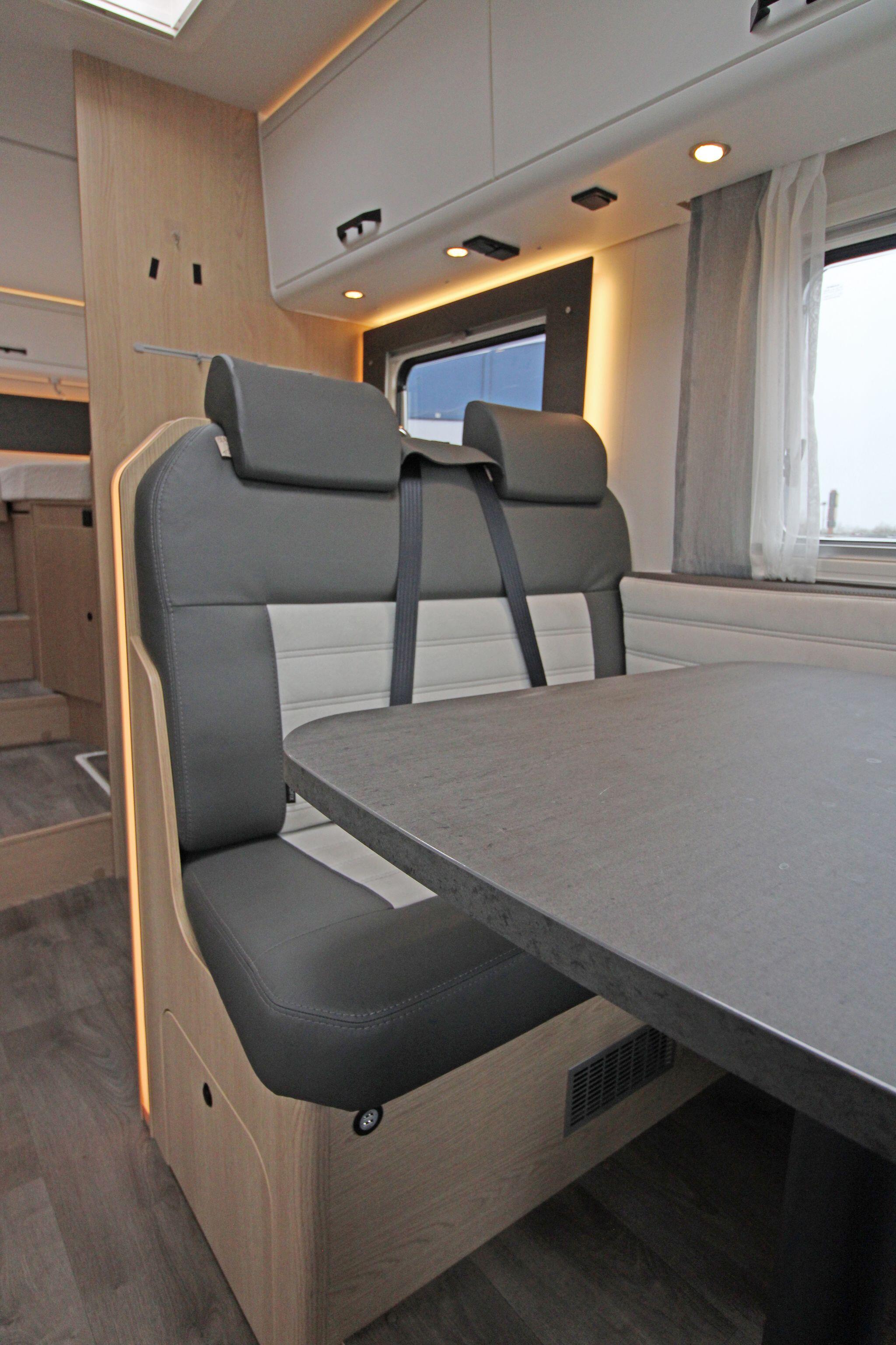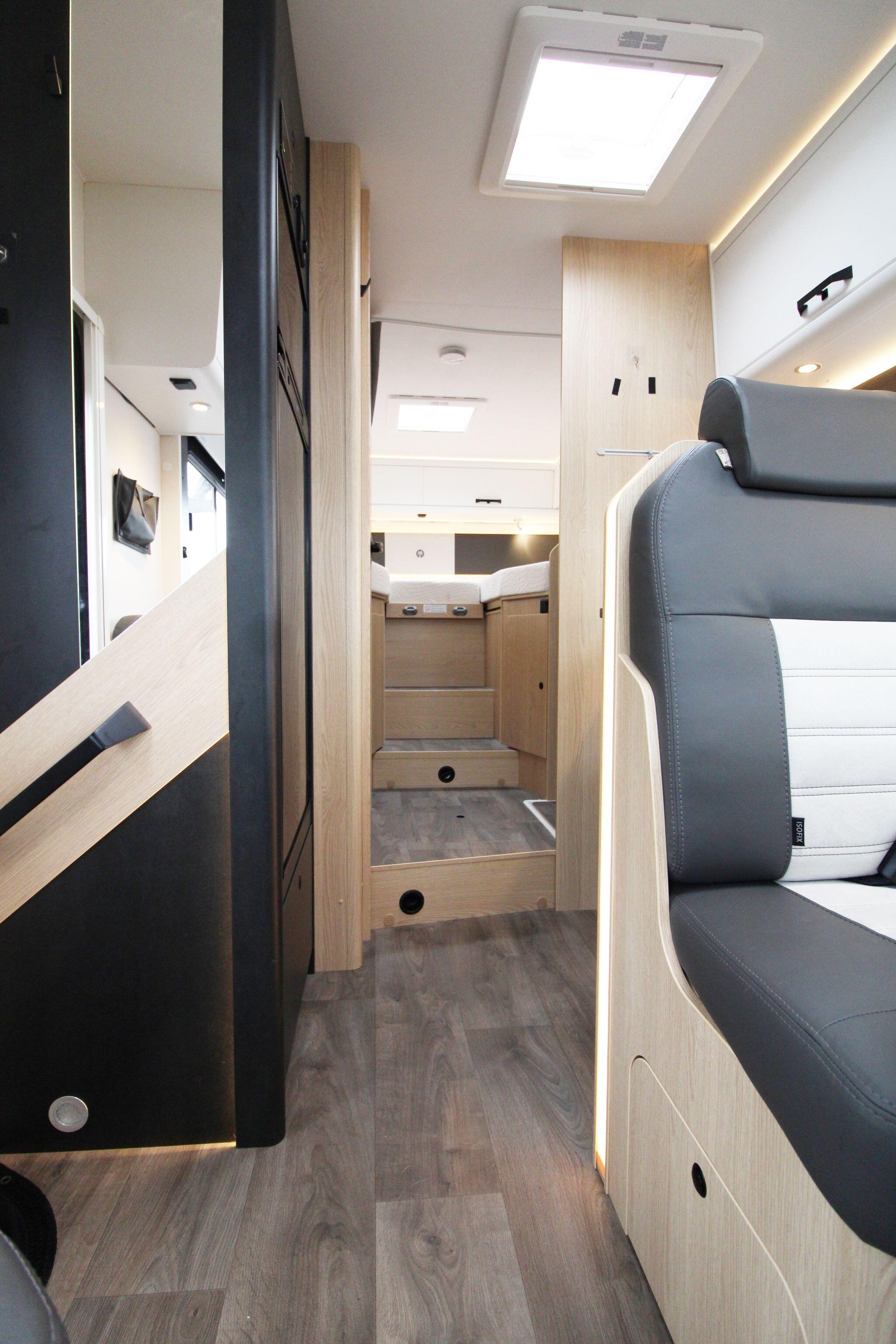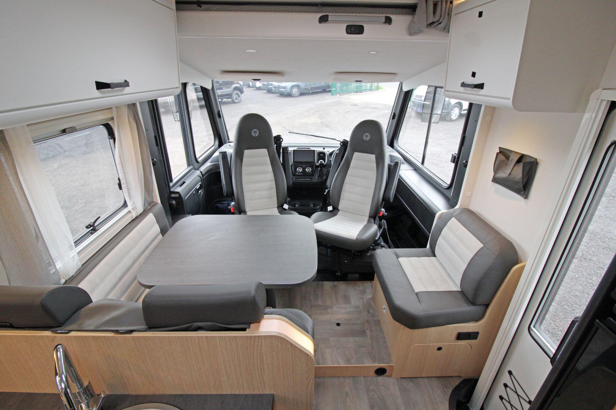 Measuring approximately 7.4 metres in length, the Sunlight I68 provides a spacious and well-designed interior that comfortably accommodates up to five people. The living area features a bright lounge with swivel captain seats, a side bench, and a dining table, creating a welcoming space for relaxing or entertaining. Large windows and a panoramic cab view allow plenty of natural light, enhancing the open and airy feel inside the motorhome.