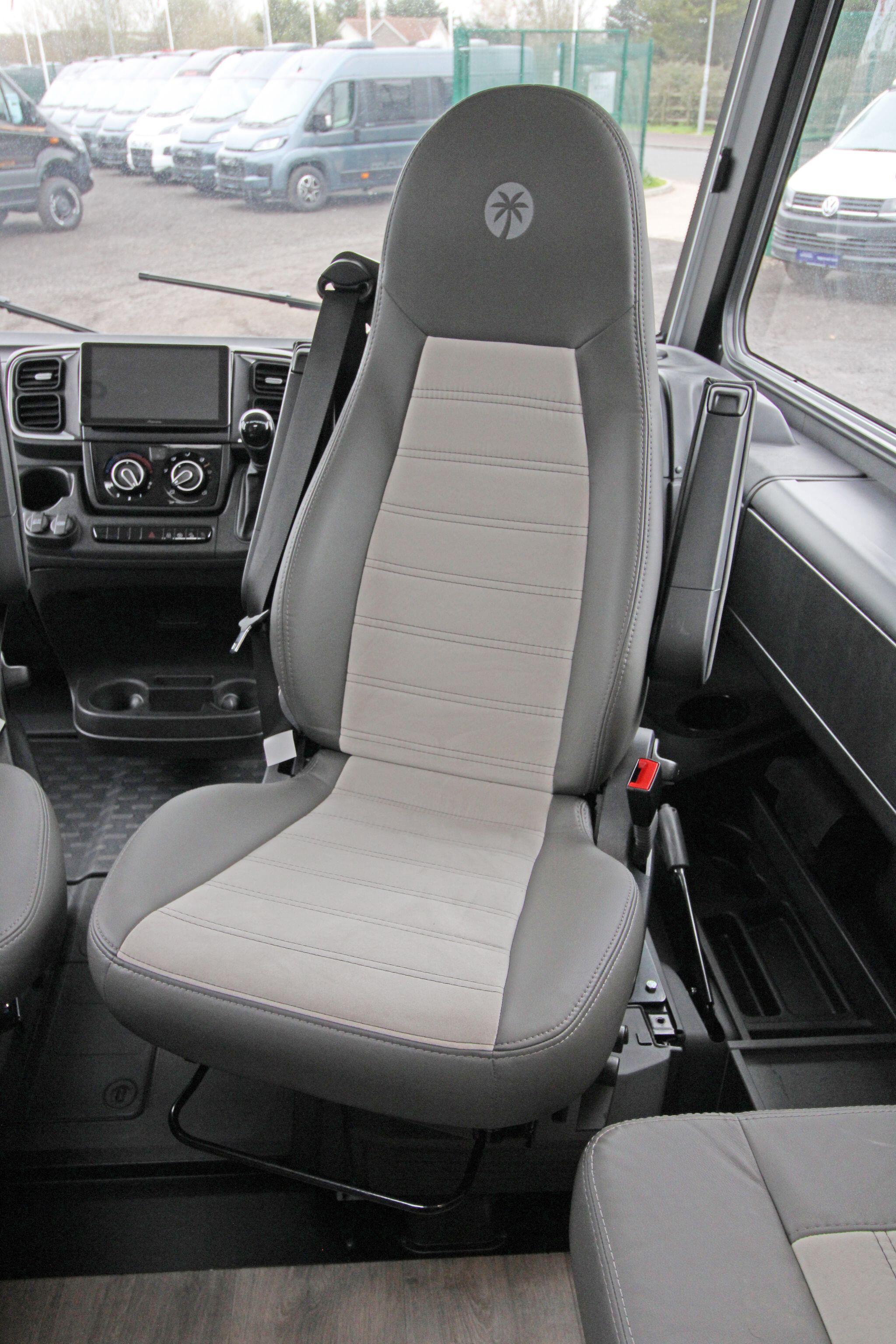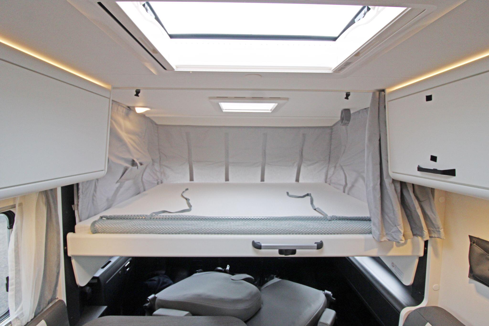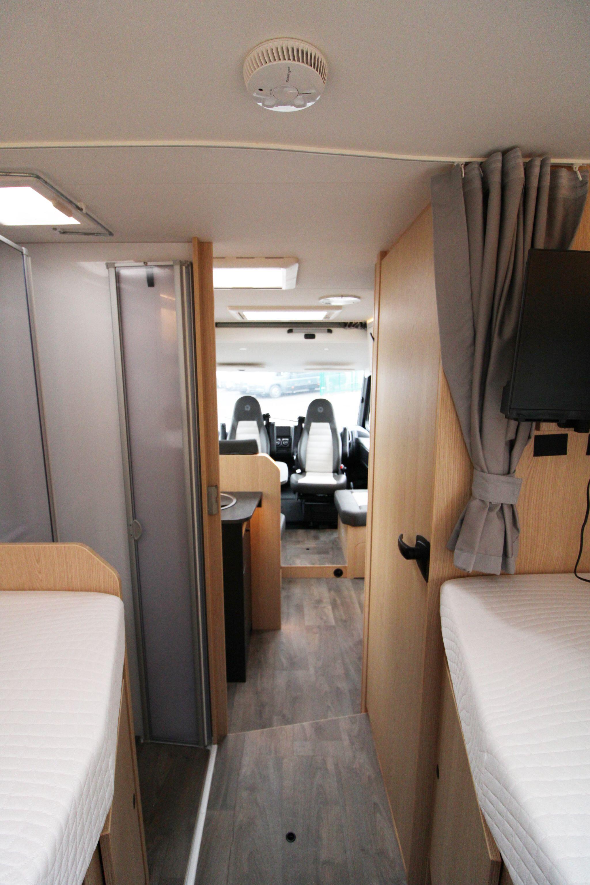 Measuring approximately 7.4 metres in length, the Sunlight I68 provides a spacious and well-designed interior that comfortably accommodates up to five people. The living area features a bright lounge with swivel captain seats, a side bench, and a dining table, creating a welcoming space for relaxing or entertaining. Large windows and a panoramic cab view allow plenty of natural light, enhancing the open and airy feel inside the motorhome.