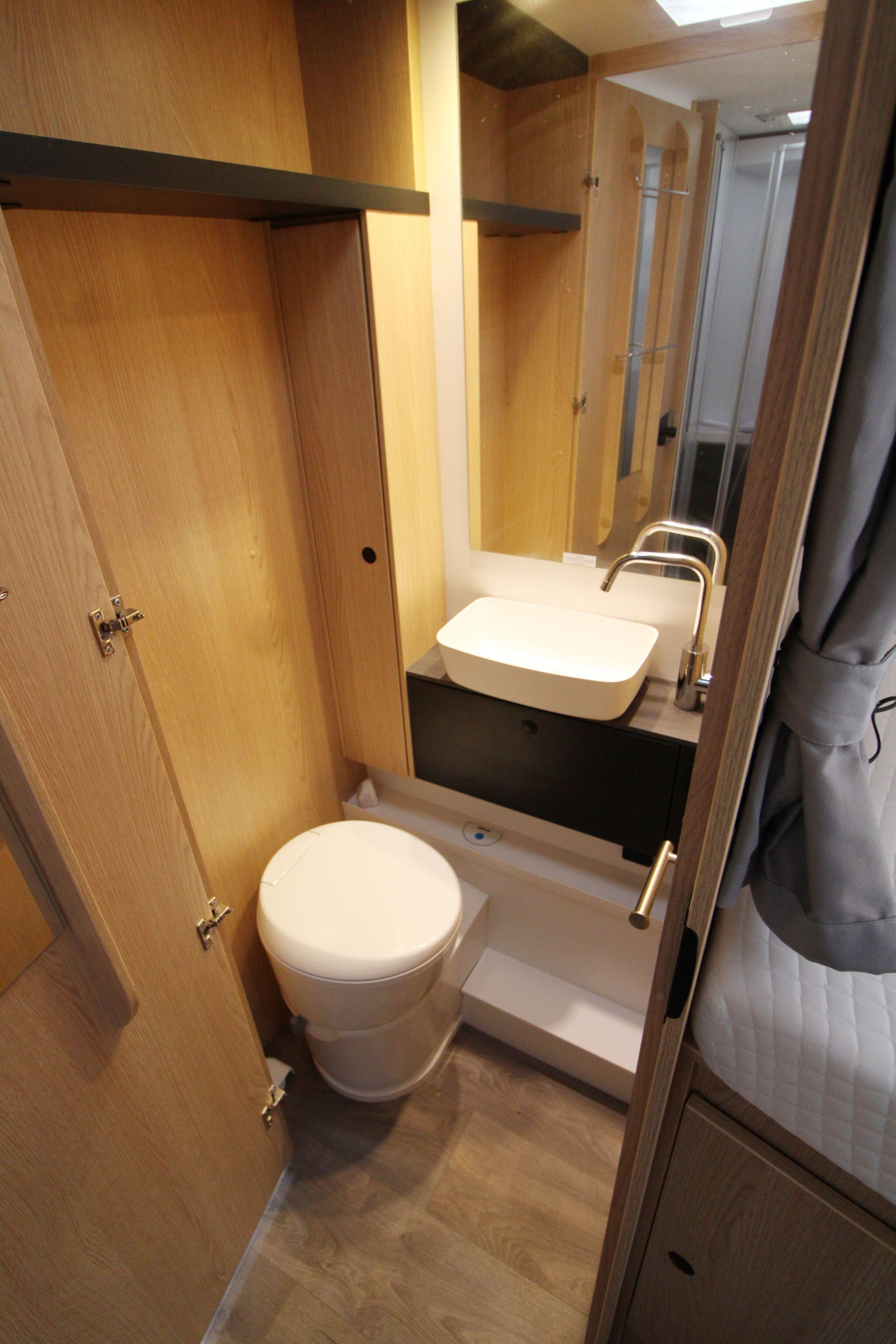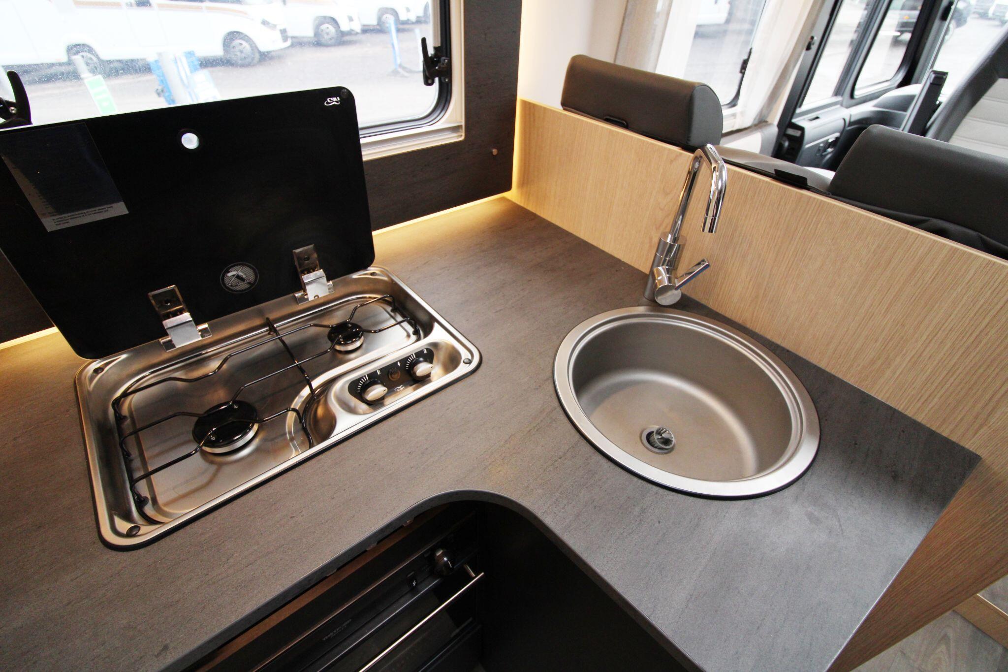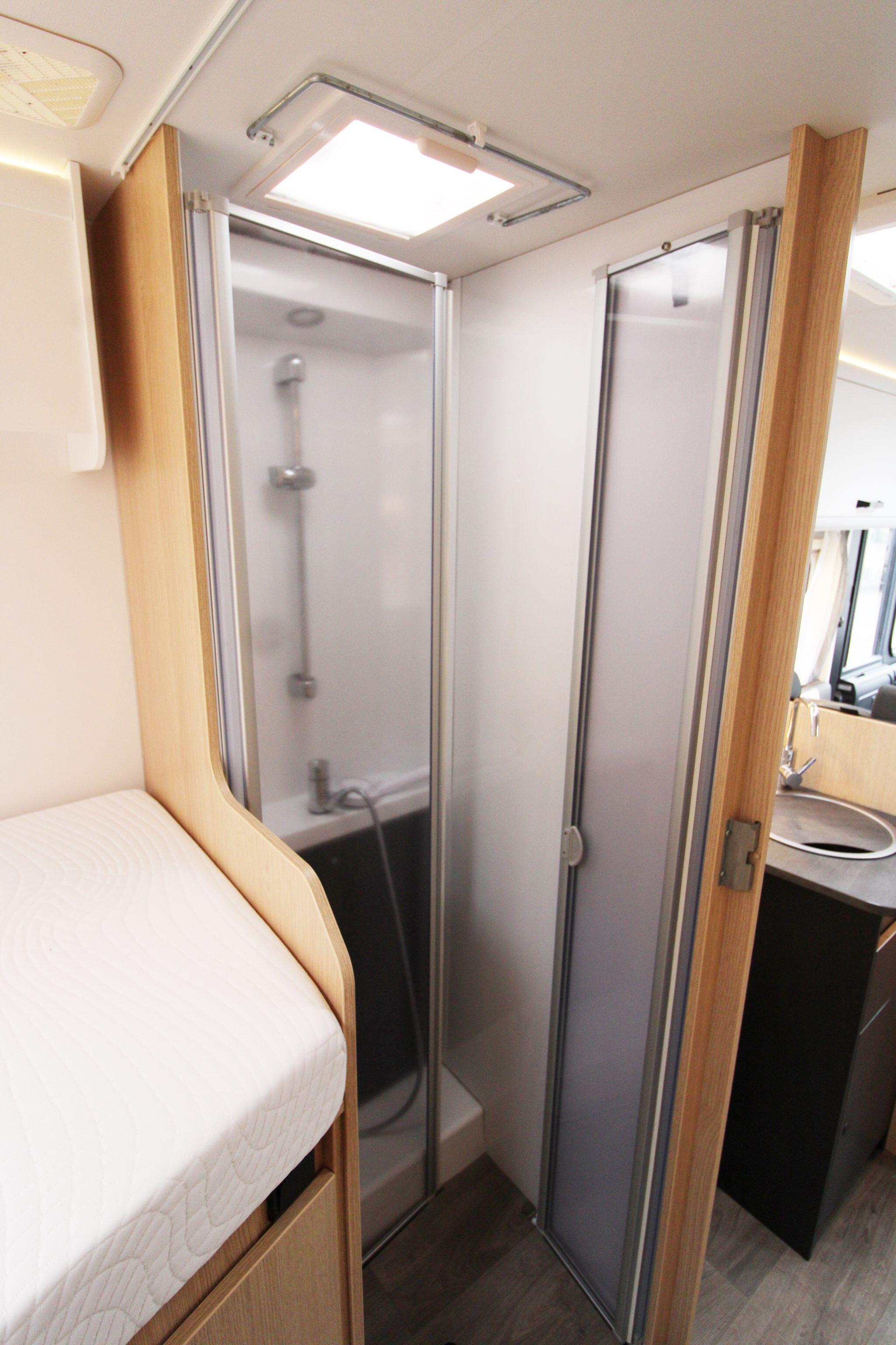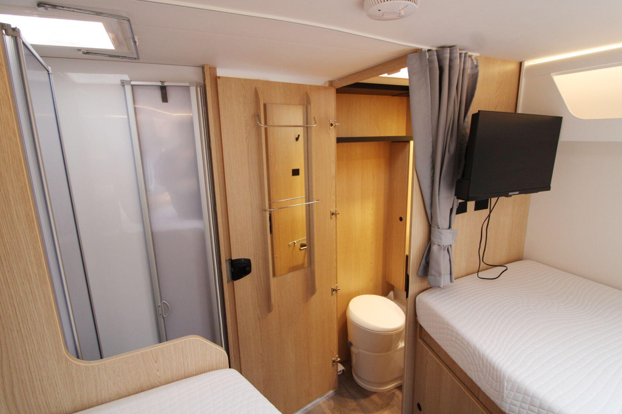 The sleeping arrangements are versatile, including fixed beds in the rear bedroom and a convenient drop-down double bed above the cab area. The kitchen is fully equipped with a hob, oven, grill, sink, and a large fridge-freezer, ensuring everything needed for cooking while travelling. Adjacent to the kitchen is a modern washroom with a cassette toilet, basin, and a separate shower cubicle.